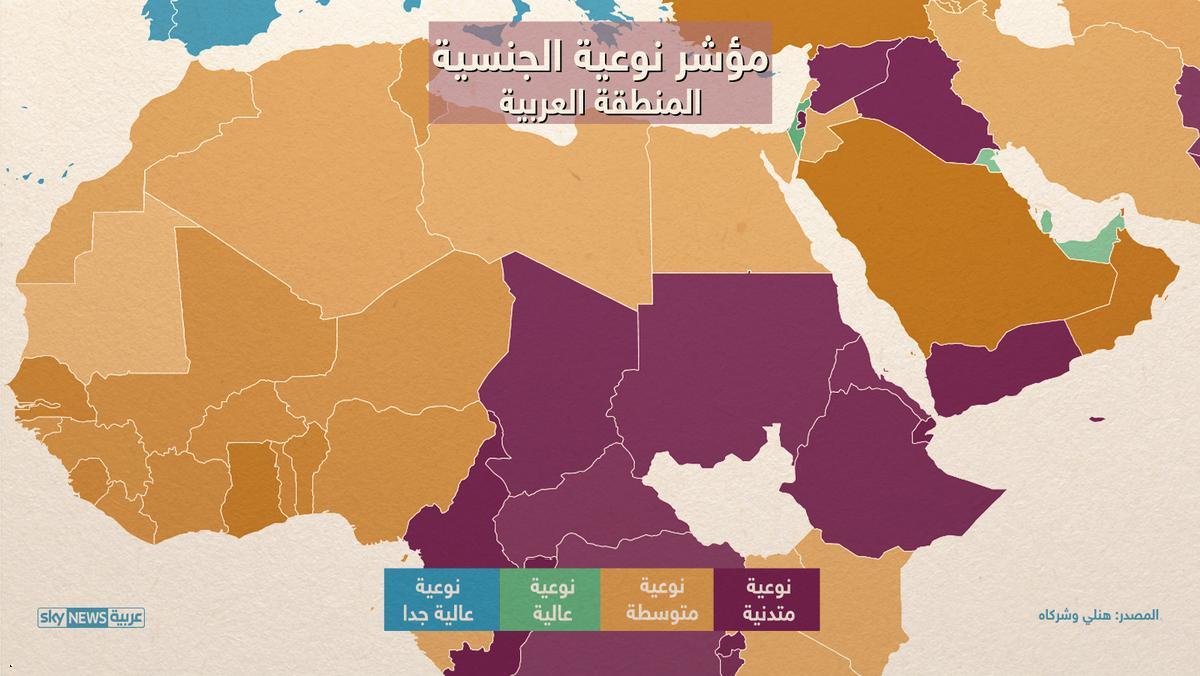 وعملت المؤسسة على تقسيم نوعية الجنسية إلى 4 أقسام هي الجودة النوعية العالية جدا ثم الجوعة النوعية العالية، وضمت كل من الإمارات وقطر والكويت فالمتوسطة وأخيرا المتدنية وشملت 4 دول عربية على الأقل حيث قبعت السودان في المركز 157 من أصل 161 جنسية وسبقتها سوريا في المركز 152 والعراق 151 واليمن 150 فجيبوتي 147 وفلسطين 141.
