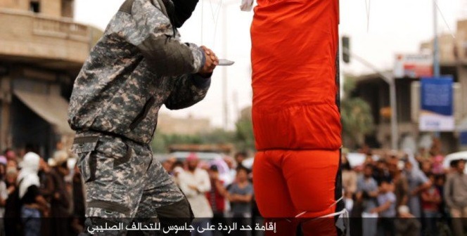 وقام عناصر التنظيم بـ “صلب” الرجل بعد إلباس “اللباس البرتقالي”، ومن ثم عمد أح عناصر التنظيم إلى غرز سكين في قلب الشاب، ومن ثم علق في عنقه لافتة كتبة عليها اسمه وأن تهمته هي أنه: ”قام بتصوير وإعطاء معلومات ومواقع للتحالف الصليبي تسببت بقتل وقصف المسلمين”.