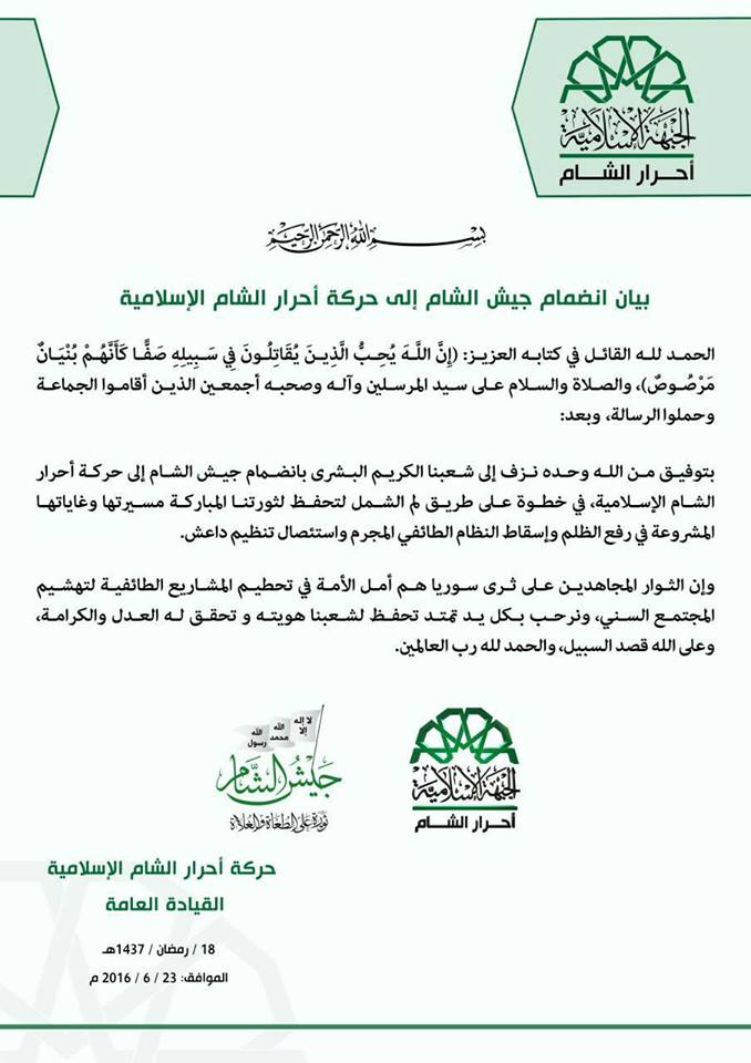 حلب : جيش الشام يعلن عن انضمامه لحركة أحرار الشام الإسلامية