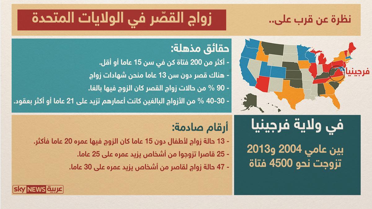وبحسب الإحصائيات في فرجينيا، فقد تزوجت نحو 4500 فتاة قاصر بين عامي 2004 و2013، من بينهن أكثر من 200 فتاة كن في سن 15 عاما أو أقل، بينما منحت عدة فتيات لا تزيد أعمارهن على 13 عاما شهادات زواج.