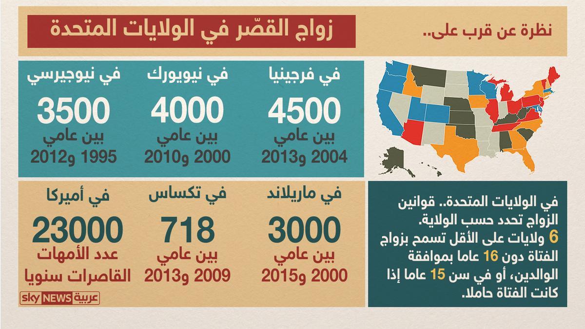 وأشارت دراسات إلى أنه تم تسجيل 3500 حالة زواج لفتيات قاصرات في نيوجيرسي بين عامي 1995 و2012، بينما تم تسجيل نحو 4000 حالة زواج لقاصرات في نيويورك بين عامي 2000 و2010، فيما سجل في ولاية تكساس 718 حالة زواج لفتيات قاصرات تتراوح أعمارهن بين 15 و17 عاما وذلك خلال الفترة بين عامي 2009 و2013.
