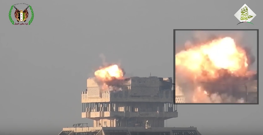 حلب : لحظة نسف الجيش الحر مدفعاً لميليشيات بشار الأسد على سطح القصر البلدي ( فيديو )