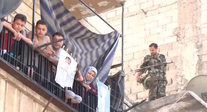 صور بشار معلقة بدلاً من الغسيل .. الإعلام الروسي يصور منطقة مدنية خاضعة لسيطرة الميليشيات النظامية في حلب على أنها منطقة الراموسة ” الصناعية ” ! ( فيديو )