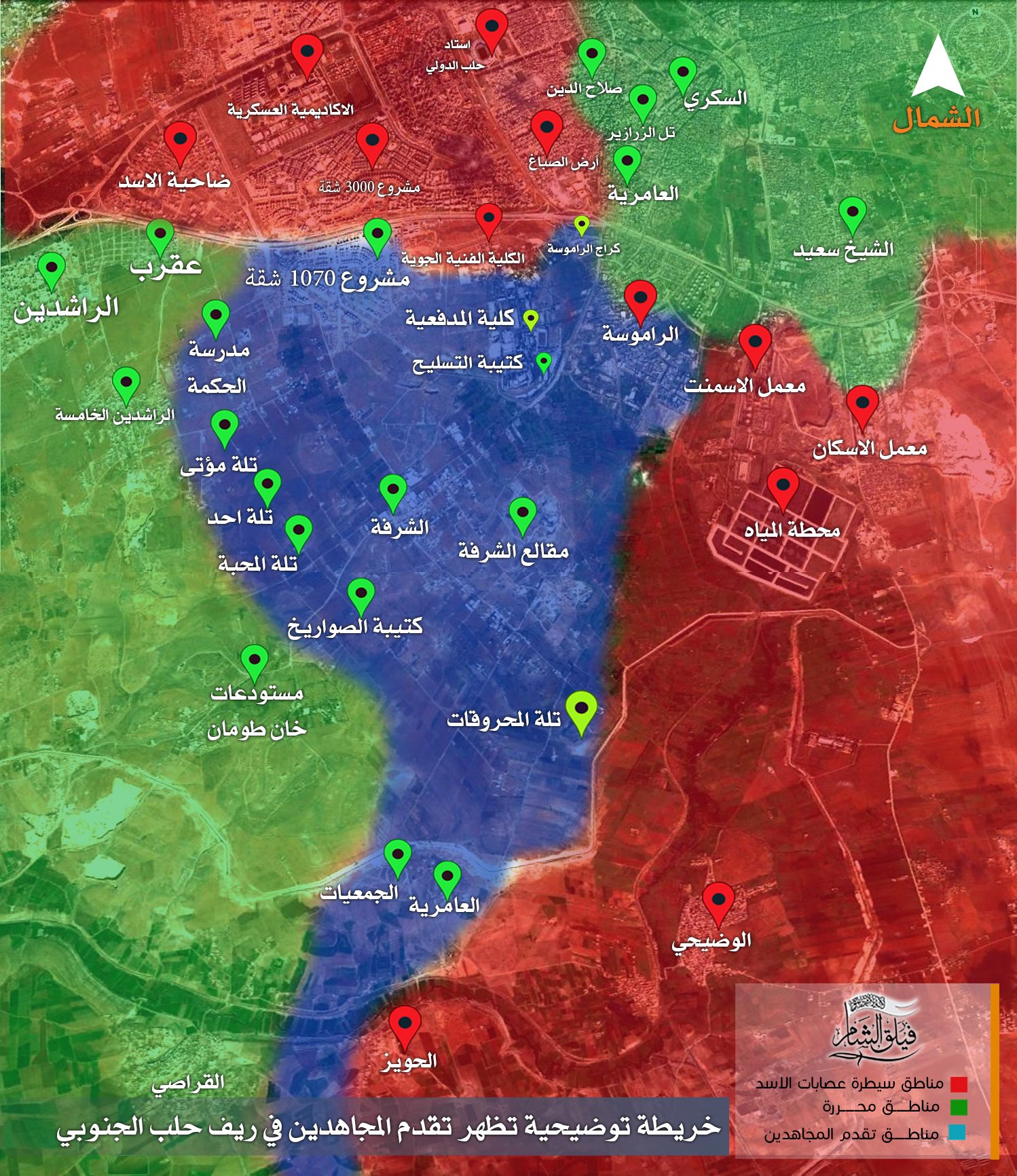 حلب : إلتقاء المقاتلين من خارج المدينة بإخوانهم داخل المدينة و العمل جاري للسيطرة على ما تبقى من النقاط لكسر الحصار ( فتح الشام )