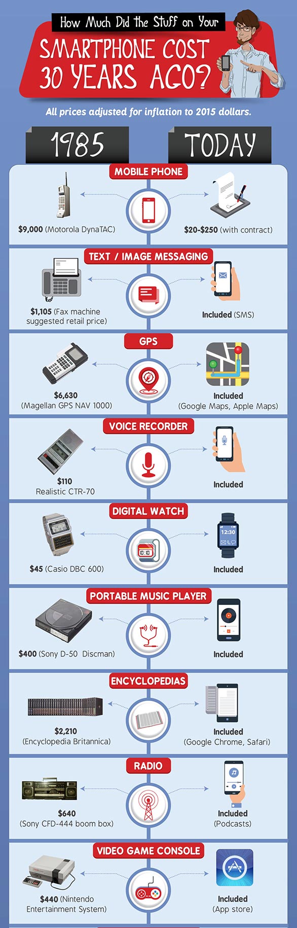 ويكشف الانفوغراف المُصاحب الإمكانات الهائلة التي يُتيحها الهاتف الذكي الحالي، مقارنةً بأسعار التجهيزات التي يتضمنها اليوم وبأسعار الآلات والأدوات التي كانت متوفرة في الفضاءات التجارية سنة 1985 لأداء نفس المهام التي تؤديها بشكل آخر في الأجهزة الذكية الحديثة، مع احتساب التضخم وسعر الدولار الثابت قبل 30 سنة.
