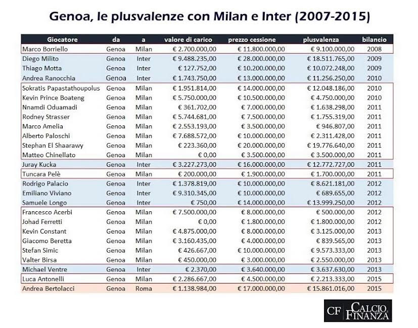 وكشف التقرير أن الخسائر المالية ناجمة عن تسوق الأندية الثلاثة من صفوف نادي جنوى خلال الفترة من عام 2007 وحتى عام 2015 لتصل قيمة ما تكبدته تلك الأندية من خسائر إلى نحو 234 مليون يورو، جراء فشل أغلب اللاعبين الذين انتقلوا من جنوى إلى مدينتي ميلان ورما.
