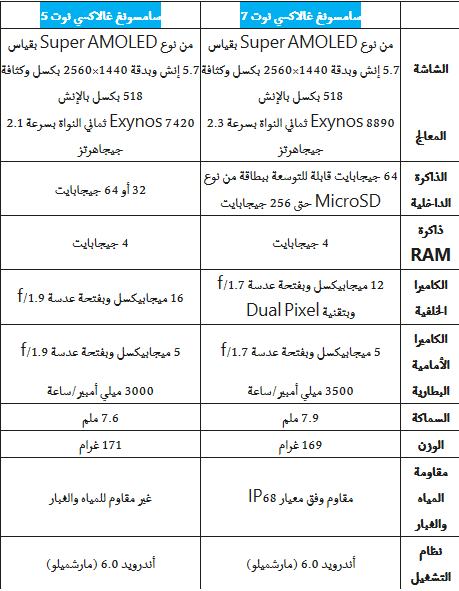 ويمكن للمستخدم الاطّلاع على الجدول التالي الذي يمثّل مقارنة من حيث المواصفات مابين غالاكسي نوت 7 وغالاكسي نوت 5 بشكلٍ مختصر، بهدف توضيح الفرق مابين الهاتفين، وفي النهاية يبقى الخيار الأخير لدى المستخدم.