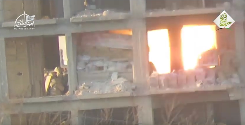 حلب : لحظة نسف الجيش الحر تجمعاً للميليشيات العراقية و الإيرانية على جبهة ” ضاحية الأسد ” ( فيديو )