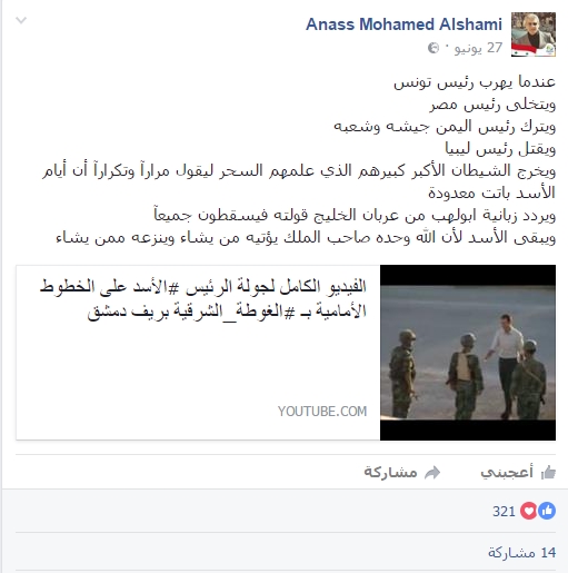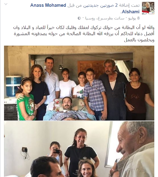 نشر أنس الشامي، العضو السابق في برلمان بشار الأسد، وأحد أكبر حيتان التشبيح و الفساد في حلب، صورة الطفل الحلبي عمران الذي قصفت طائرات بشار الأسد منزله في حي القاطرجي بحلب، والتي انتشرت على نحو واسع، عبر صفحته في فيسبوك، لائماً الحكام العرب على ما حدث له.
