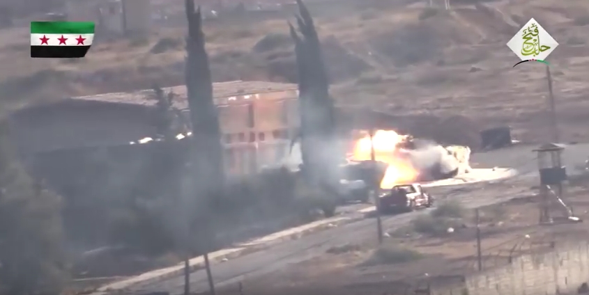 حلب : عربة مدرعة أخرى لميليشيات بشار الأسد ضحية لصواريخ الثوار بالقرب من ” الفنية الجوية ” ( فيديو )
