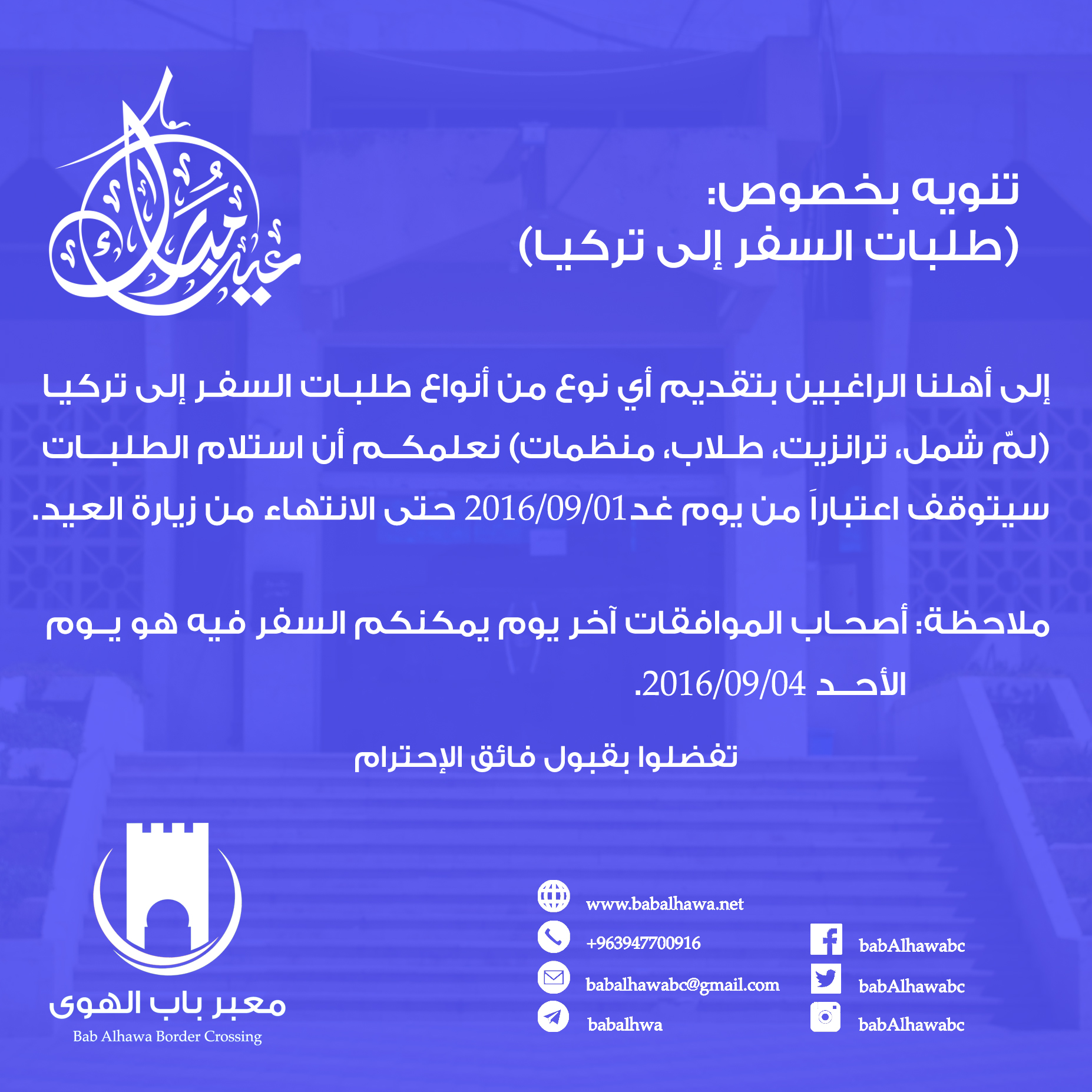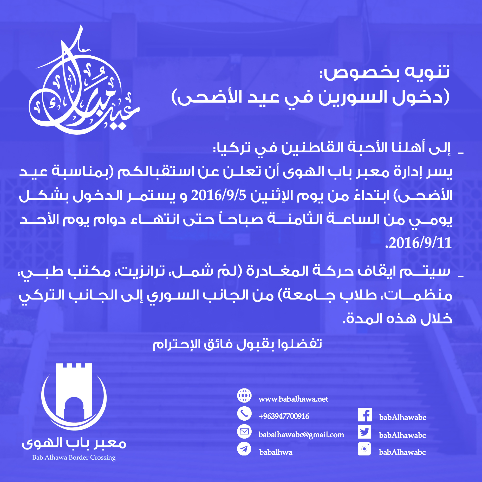 معبر باب الهوى : تنويهات حول طلبات السفر إلى تركيا و دخول السوريين في عيد الأضحى