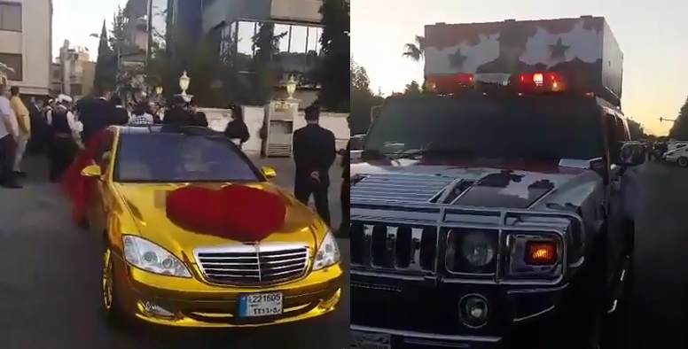 سيارة ” مرسيدس ” مطلية بالذهب و همرات بشار الأسد تزف ابن مسؤول نظامي في دمشق ( فيديو )