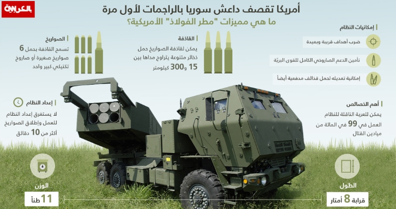 نفذت راجمات صواريخ متطورة أمريكية الصنع للمرة الأولى عمليات قصف يعتقد أنها من الحدود التركية على مراكز لتنظيم داعش في سوريا وفقا لما أعلنته واشنطن التي قالت إن عمليات القصف جرت باستخدام نظام راجمات الصواريخ المتطورة “HIMARS” (مطر الفولاذ).