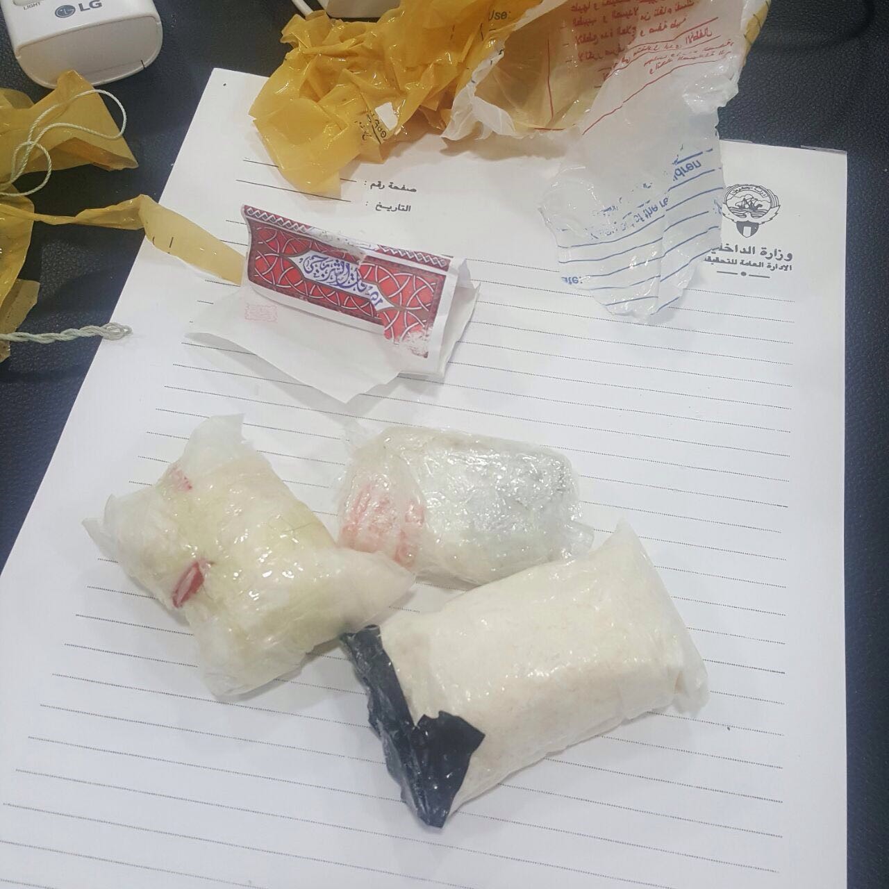 وبعد إسقاط الطائرة وفتح الظرف عُثر على 3 أكياس بلاستيكية كبيرة الحجم يوجد في كل كيس منها مادة بيضاء يشتبه بأن تكون من المواد المخدرة.