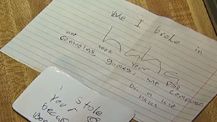 أورد موقع KHOU الإلكتروني المحلي أن طفلا نهب منزلا في جنوب غرب هيوستن، وترك ورقة علل فيها دوافع تصرفه هذا مع ورقة أخرى تحتوي على قائمة الأشياء المسروقة من المنزل.