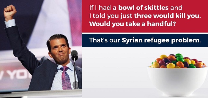 ورافق ترامب الابن الصورة بالتعليق: “هذه الصورة تعبر عن كل شيء. دعونا ننهي جدول أعمال السياسة اللائقة التي لا تضع أميركا أولاً.” وكُتب على الصورة :”إذا أخبرتك أن وعاء حلوى السكيتلز هذا، ستقتلك منه ثلاثة فقط.. هل تأخذ حفنة منه؟ هذه مشكلتنا مع اللاجئين السوريين.”