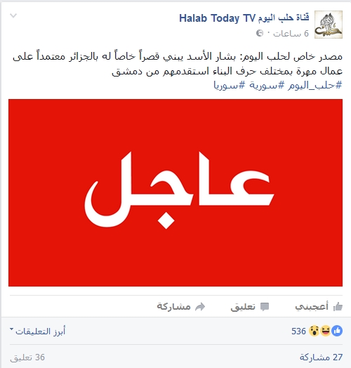 قالت قناة “حلب اليوم”، نقلاً عن مصادر خاصة لم تسمها، إن بشار الأسد يبني قصراً خاصاً له في الجزائر.