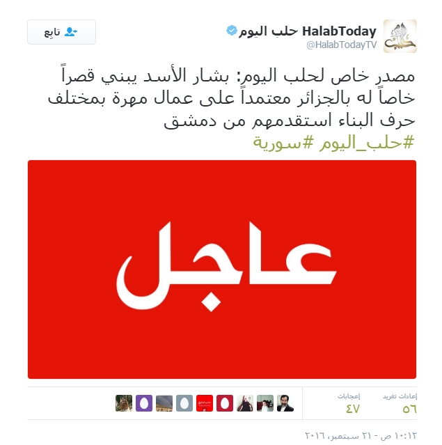 وأفادت القناة، يوم أمس الأربعاء، عبر صفحاتها الرسمية في مواقع التواصل الاجتماعي (فيسبوك – تويتر)، إن بشار يعتمد في بناء قصره على عمال مهرة بمختلف حرف البناء.