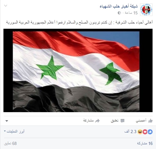 وفي اعتراف صريح يؤكد أن ما يقوم به النظام وروسيا هو وضع الحلبيين بين خيار الموت أو الاستسلام، نشرت “شبكة أخبار حلب الشهباء”، أكبر الصفحات الموالية في حلب (430 ألف متابع)، والتي يشرف على متابعتها مخبرون تابعون لفرع المخابرات الجوية، منشوراً جاء فيه : “أهالي أحياء حلب الشرقية : إن كنتم تريدون الصلح والسلام ارفعوا أعلام الجمهورية العربية السورية”، وحاز على آلاف الإعجابات.