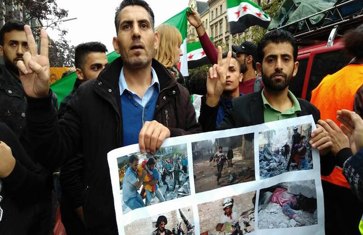 ورفع المحتجون أعلام الثورة السورية، وتلوا بياناً مشتركاً، يشير إلى مقتل ألف و700 شخص خلال الشهر الماضي، في عمليات قصف للسلاح الجوي للنظام السوري والروسي على حلب.