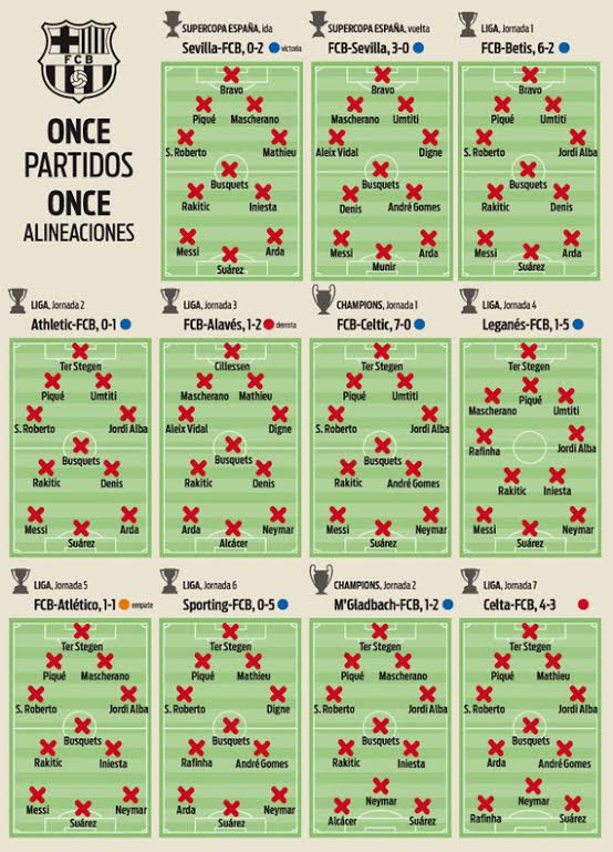 وبحسب ما ذكرت صحيفة إيلاف ، على مدار 11 مباراة لم يستقر لويس انريكي على التوليفة الأساسية المناسبة للفريق، حيث أقدم على إجراء تغييرات كبيرة، حتى عندما كان الفريق يحقق الانتصارات، مخالفًا بذلك للقاعدة السائدة التي يلتزم بها المدراء الفنيون بأن الفريق الذي يفوز لا يُغير.