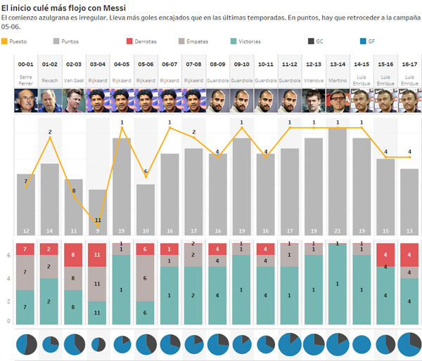 وفي الموسم الأخير لبرشلونة مع المدرب الهولندي فرانك رايكارد 2007-2008 ، نجح الفريق بقيادة ميسي في حصد 17 نقطة احتل بها المركز الثاني الذي أنهى به الموسم وصيفًا لغريمه ريال مدريد،  بينما في الموسم الذي سبقه 2006-2007 (أول موسم لميسي كلاعب أساسي ) نجح الفريق في اعتلاء الصدارة برصيد 16 نقطة حصدها من خمسة انتصارات وتعادل مع هزيمة واحدة.