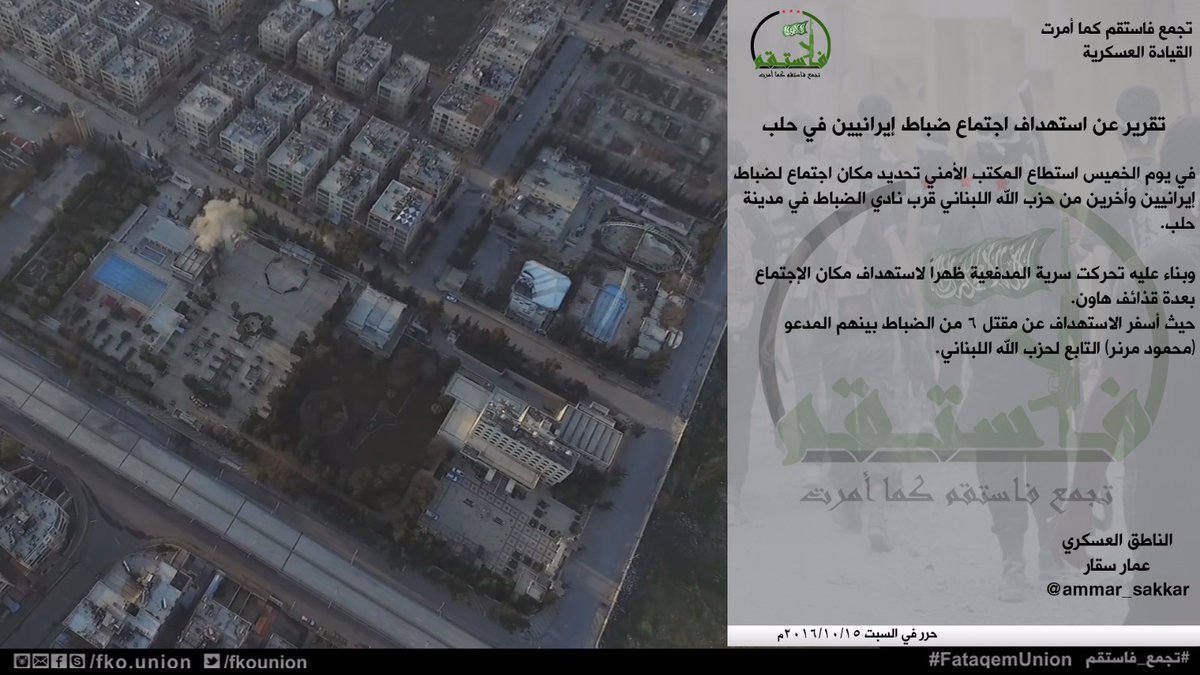 قال تجمع فاستقم كما أمرت (الجيش الحر)، إنه استهداف اجتماعاً لضباط إيرانيين في حلب.