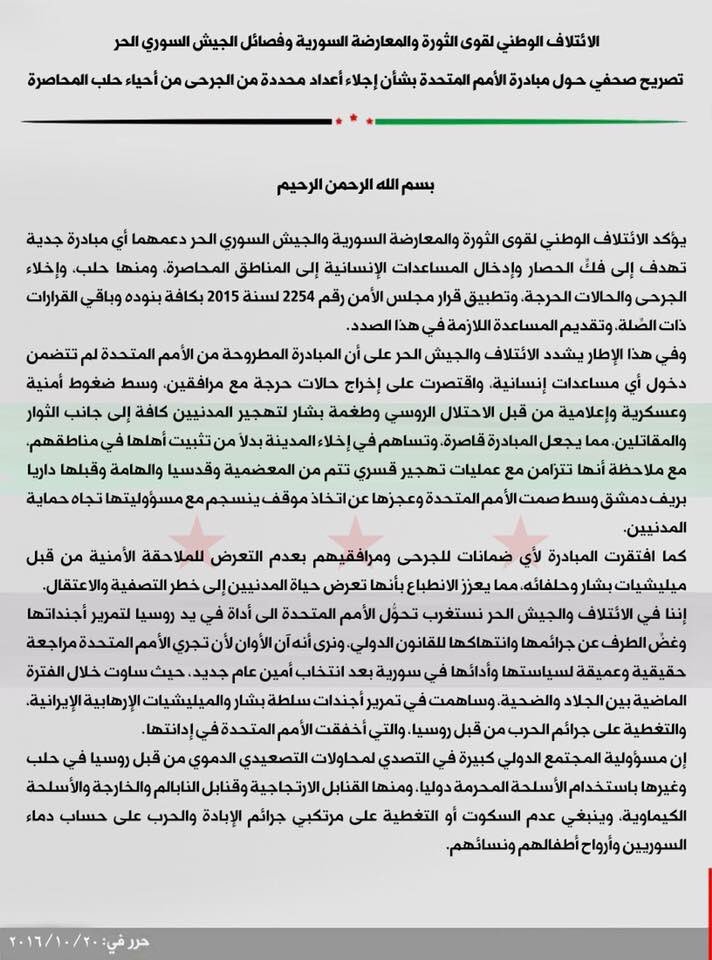 الائتلاف الوطني و الجيش الحر يصدران بياناً مشتركاً حول مبادرة الأمم المتحدة لإخراج الجرحى من حلب المحاصرة