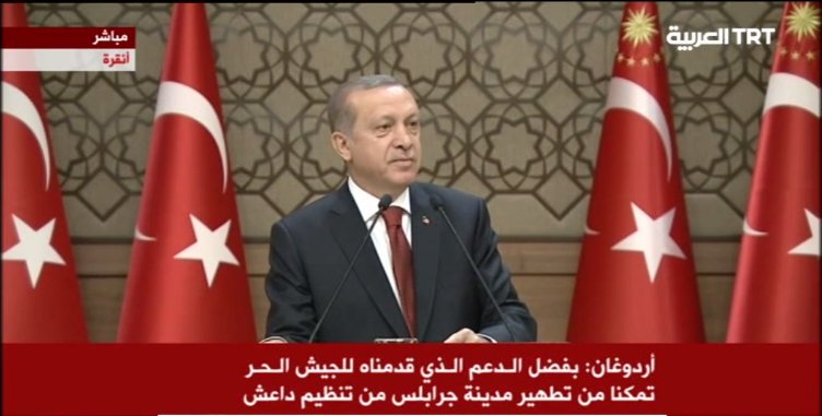 نفى الرئيس التركي رجب طيب أردوغان سعي بلاده لتوسيع عملياتها العسكرية لتصل إلى مدينة حلب، وأكد أن عمليات الجيش التركي في سوريا تهدف إلى تأمين السيطرة على مدينتي الباب ومنبج التي كان يسيطر عليهما تنظيم الدولة الإسلامية.