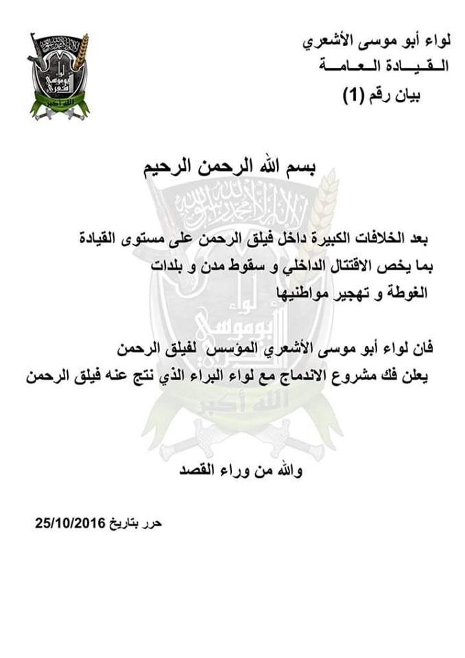 دمشق : ” لواء أبو موسى الأشعري ” أحد الألوية المشكلة لفيلق الرحمن يعلن عن انفصاله عن الفيلق بسبب خلافات ( بيان )