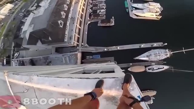 في مشهد يحبس الأنفاس، أقدم مغامر على القفز بنجاح من فوق سطح بناء شاهق الارتفاع مؤلف من ثمانية طوابق إلى المياه، وقام بتصوير نفسه بكاميرا مثبتة على خوذته.