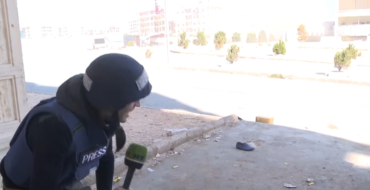 وقال المراسل مراد غازدييف إن “عملية القصف بدأت بعد مرور 10 دقائق على وصول الفريق إلى موقع على الخطوط الدفاعية للجيش السوري في حي حلب الجديدة”.