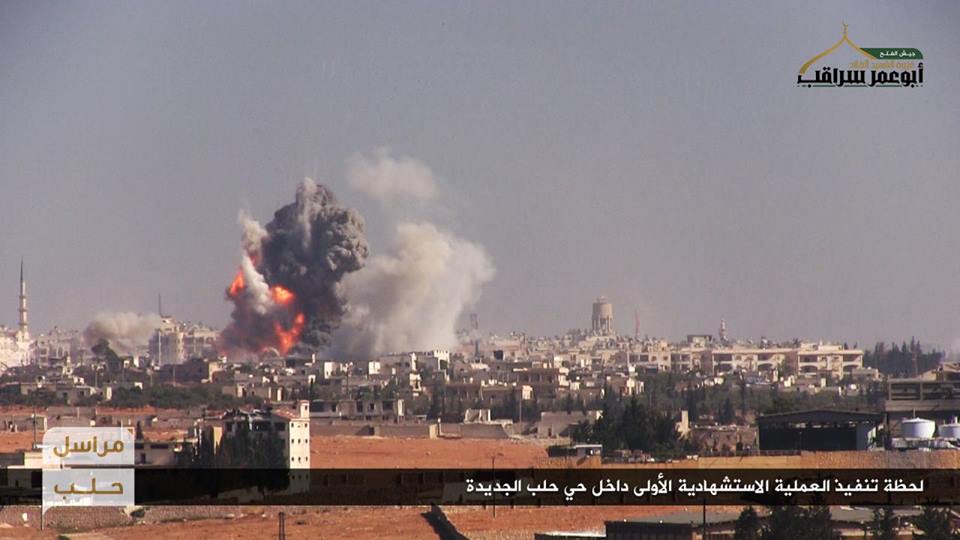 فيديو : لحظة انفجار السيارة المفخخة الأولى التي قالت جبهة فتح الشام إنها استهدفت قوات النظام في حلب الجديدة
