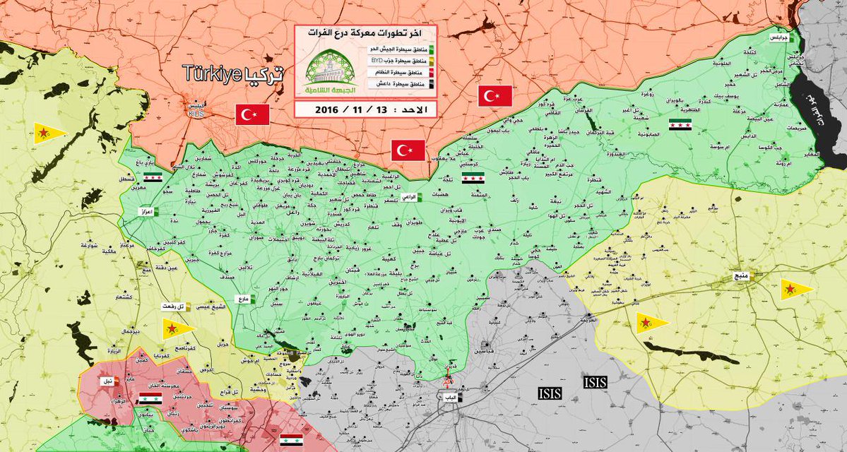 وسيطرت قوات المعارضة على 202 قرية ممتدة على مساحة ألف و620 كيلومتر منذ انطلاق عملية درع الفرات في 24 أغسطس/ آب الماضي، بحسب البيان.