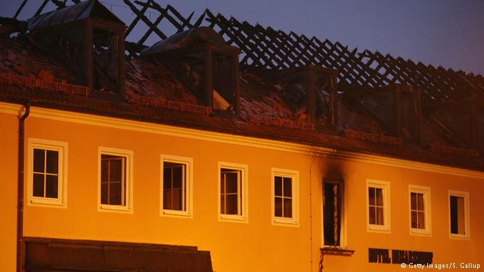 وكانت النار أضرمت في فندق آنذاك، كان من المقرر أن يأوي لاجئين في شهر فبراير/ شباط. وذكرت الشرطة أن متفرجين على الحادث أظهروا فرحة كبيرة وأدلوا بتعليقات غير لائقة بشأن اللاجئين، ما أدى إلى موجة إدانات واسعة في ألمانيا. (DPA)