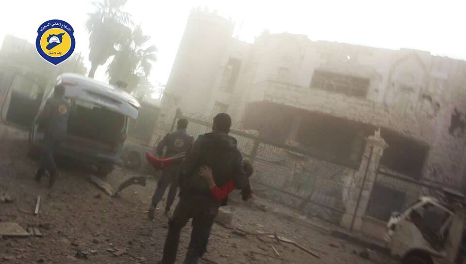 دمشق : مشاهد مرعبة تظهر عمليات إجلاء الأطفال و المدنيين الجرحى بعد قصف طائرات بشار الأسد لمدينة دوما ( فيديو )