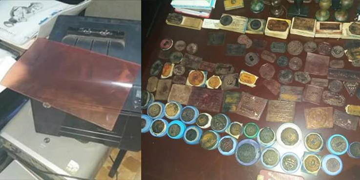 وضبطت الشرطة مكان إقامة السوري، وعثرت لديه على 193 ختماً لمؤسسات الدولة (الهجرة والجوازات – السجل المدني – وزارة الداخلية – معبر السلوم – الشهادات الثانوية – المصارف – …).