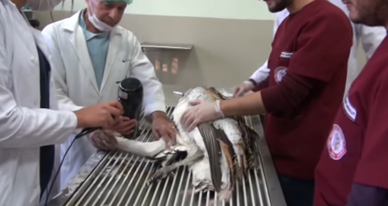 تركيا : أطباء يجرون عملية تجبير لساق ” طائر الحبارى الكبير ” بعد تعرضها للكسر ( فيديو )