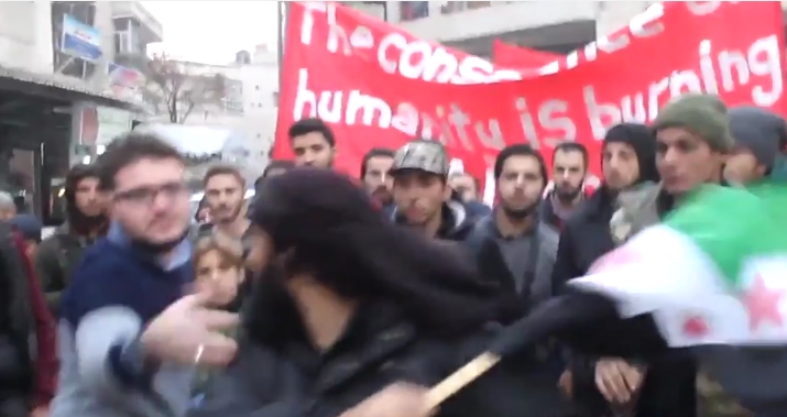 إدلب : اعتداء على مظاهرة طالبت بتوحد الفصائل بسبب رفع المتظاهرين لعلم الثورة ( فيديو )