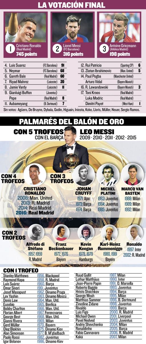 وتوج كريستيانو رونالدو بجائزة الكرة الذهبية لأفضل لاعب في العالم لعام 2016 بحسب التصويت الذي أجرته مجلة “فرانس فوتبول” الفرنسية، متفوقا على ميسي الذي حل ثانيا، في حين احتل المركز الثالث الفرنسي انطوان غريزمان مهاجم أتلتيكو مدريد الاسباني.