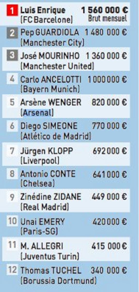 واعتلى إنريكي القائمة بفضل 1.5 مليون يورو يجنيها المدرب الإسباني شهريا بعد خصم الضرائب، متفوقا على مواطنه بيب غوارديولا مدرب مانشستر سيتي الإنكليزي، الذي يتقاضى راتبا شهريا يقدر بـ 1.4 مليون يورو.