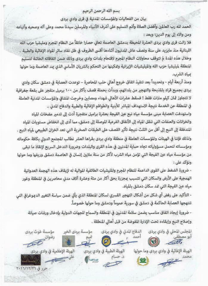 دمشق : مؤسسات و فعاليات وادي بردى المدنية تناشد المجتمع الدولي إنقاذ العاصمة من ” كارثة مائية ” بعد قصف طائرات بشار الأسد لعين الفيجة ( فيديو )