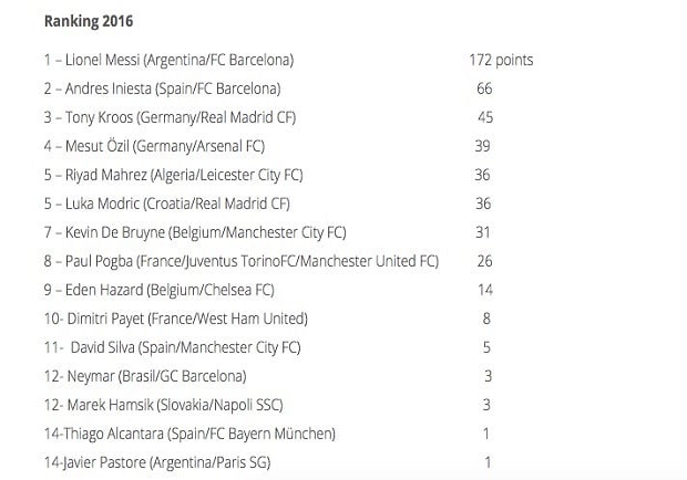 وتصدر البرغوث الأرجنتيني القائمة التي نشرها موقع “الاتحاد الدولي للتأريخ والإحصاء” على الشبكة العنكبوتية بفضل أرقامه اللافتة على مستوى صناعة اللعب في سنة 2016 إذ حلق في الصدارة برصيد 172 نقطة محققاً اللقب للمرة الثانية في مسيرته الاحترافية.