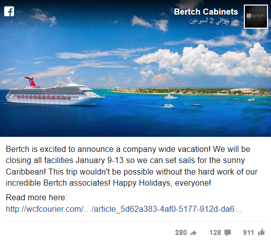 وأعلنت الشركة، التي يقع مقرها في ولاية أيوا الأمريكية، عن الرحلة البحرية الفاخرة على صفحتها بموقع التواصل الاجتماعي “فيسبوك”، معلقة: “نحن متحمسون للإعلان عن إجازة كبيرة لشركتنا! سنغلق جميع مرافقنا من التاسع إلى الـ13 من كانون الثاني، لنبحر عبر منطقة البحر الكاريبي المشمسة ! لم تكن لتكون هذه الرحلة ممكنة، دون عمل زملائنا الشاق في بيرتش! أعياداً سعيدة للجميع!”