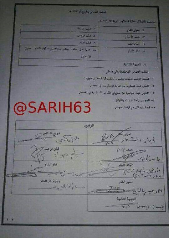 وبعد انتشار البيان على نحو واسع، قال القيادي في حكرة أحرار الشام “إياد الشعار”، عبر تغريدات له في موقع تويتر، إن هذا البيان عبارة عن مسودة اتفاق، وكان من المتفق أن لا يتم الإعلان عنه إلا بعد الانتهاء من العمل بحيث يصبح جاهزاً بعد 3 أشهر.