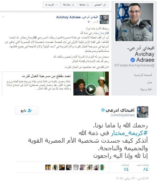 ووفقاً لشبكة إرم نيوز ، لم يكتف أدرعي بتغريدة التويتر، حيث نشر نعيًا آخر على حسابه الرسمي بالفيسبوك، مشيراً إلى أنه من الواجب عليه أن يتحدث عن الفنانة المصرية القديرة الراحلة كريمة مختار، والتي تابع أعمالها على القناة الإسرائيلية الأولى في أيام الجمعة.