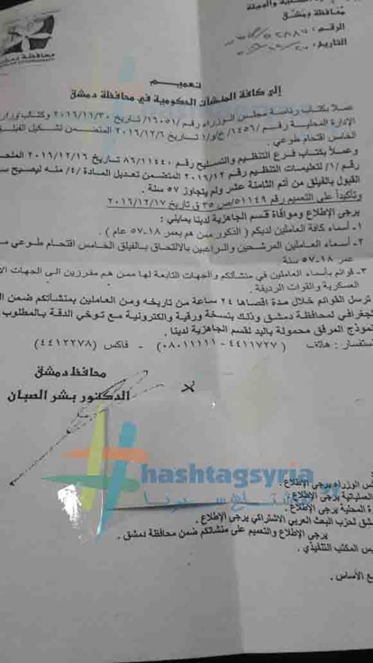 نشرت وسائل إعلام موالية تعميماً صادراً عن محافظ بشار الأسد في دمشق، يطلب فيه من المؤسسات الحكومة في المحافظة “إرسال أسماء جميع العاملين الذكور من هم بعمر 18 – 57 عاماً”.