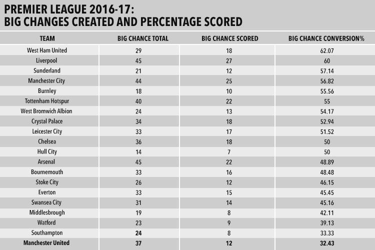 وبحسب الإحصائيات، فإن نادي مانشستر يونايتد الذي يحتل المركز السادس في الترتيب العام لمسابقة” البريمرليغ”، وبالرغم من تواجد السلطان السويدي زلاتان إبراهيموفيتش والإنكليزي واين روني والفرنسي بول بوغبا إلا انه لم ينجح سوى في بلوغ ما نسبته 32% بعدما نجح في ترجمة 12 فرصة فقط إلى أهداف من أصل 37 فرصة صنعها، وهي نسبة ضعيفة وسلبية لفريق ينافس على لقب البطل أو الوصيف.