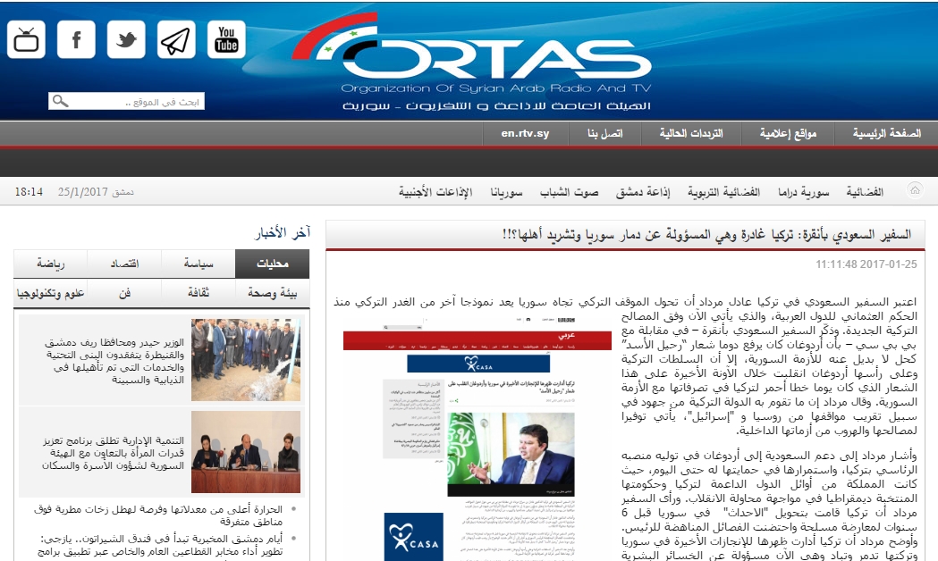 وزعم التلفزيون النظامي أن سفير السعودية في أنقرة قال إن “تحول الموقف التركي تجاه سوريا يعد نموذجا آخر من الغدر التركي منذ الحكم العثماني للدول العربية”.