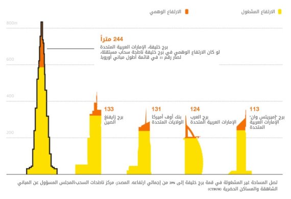 فمثلاً أطول مبنى في العالم، #برج_خليفة في #دبي يصل طوله المدهش إلى 828 متراً، لكنَّ ثلثه تقريباً (29%) لا يمكن شَغله، وذلك وفقاً للمجلس المسؤول عن المباني الشاهقة والمساكن الحضرية (CTBUH). وكذلك بالنسبة لبرج العرب في دبي إذ تبلغ المساحة غير المستغلة فيه 39% من مساحته الإجمالية.